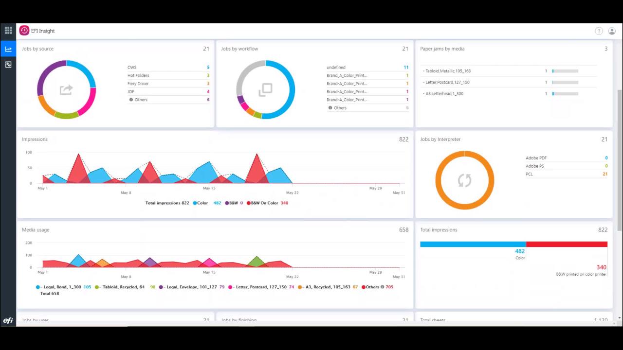 - 利用 Fiery Insight 捕获打印生产数据并转换为可操作的分析,以推动业务改进